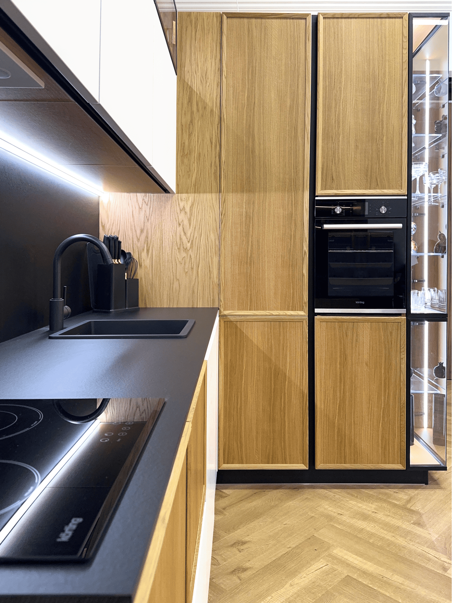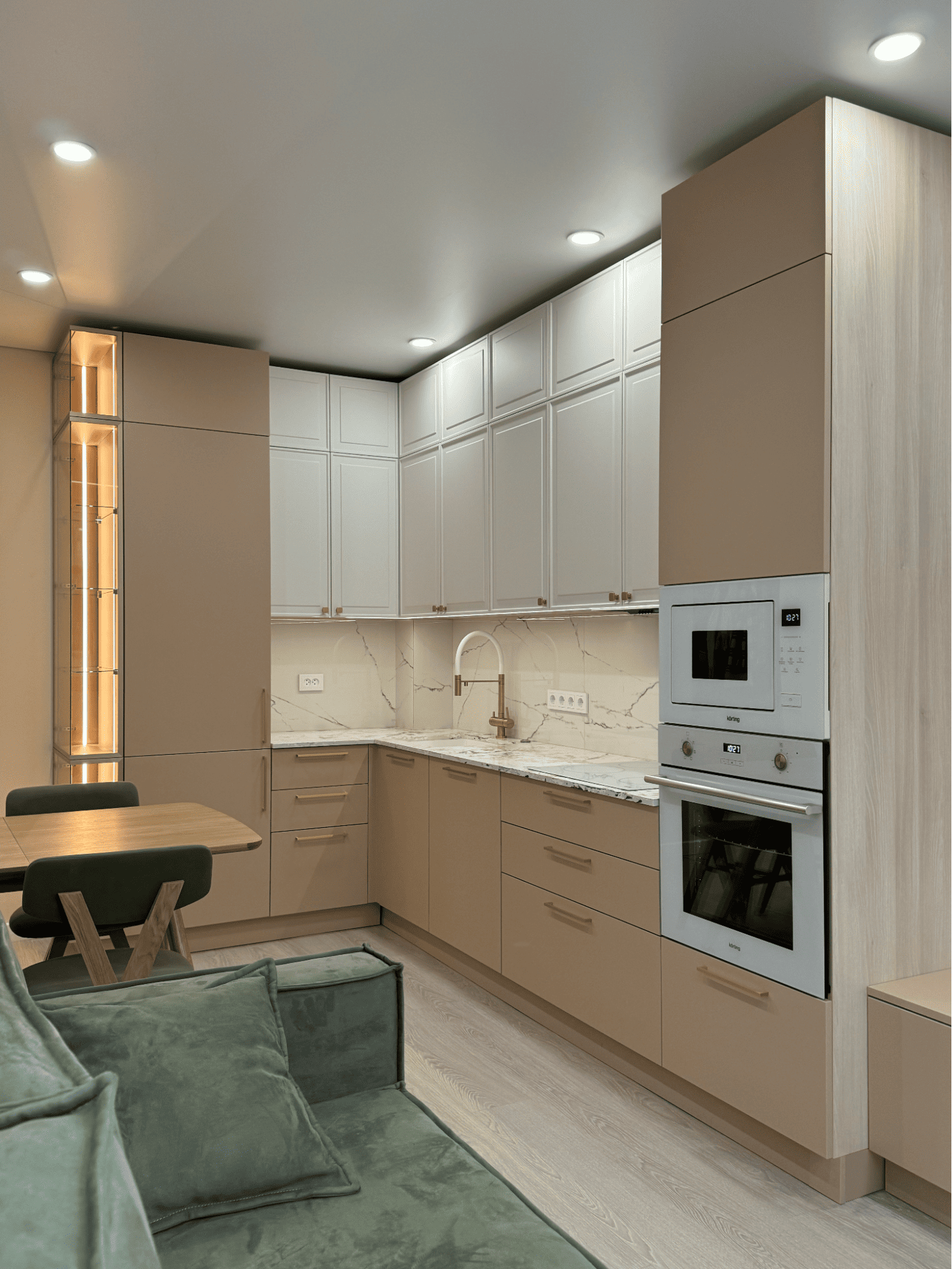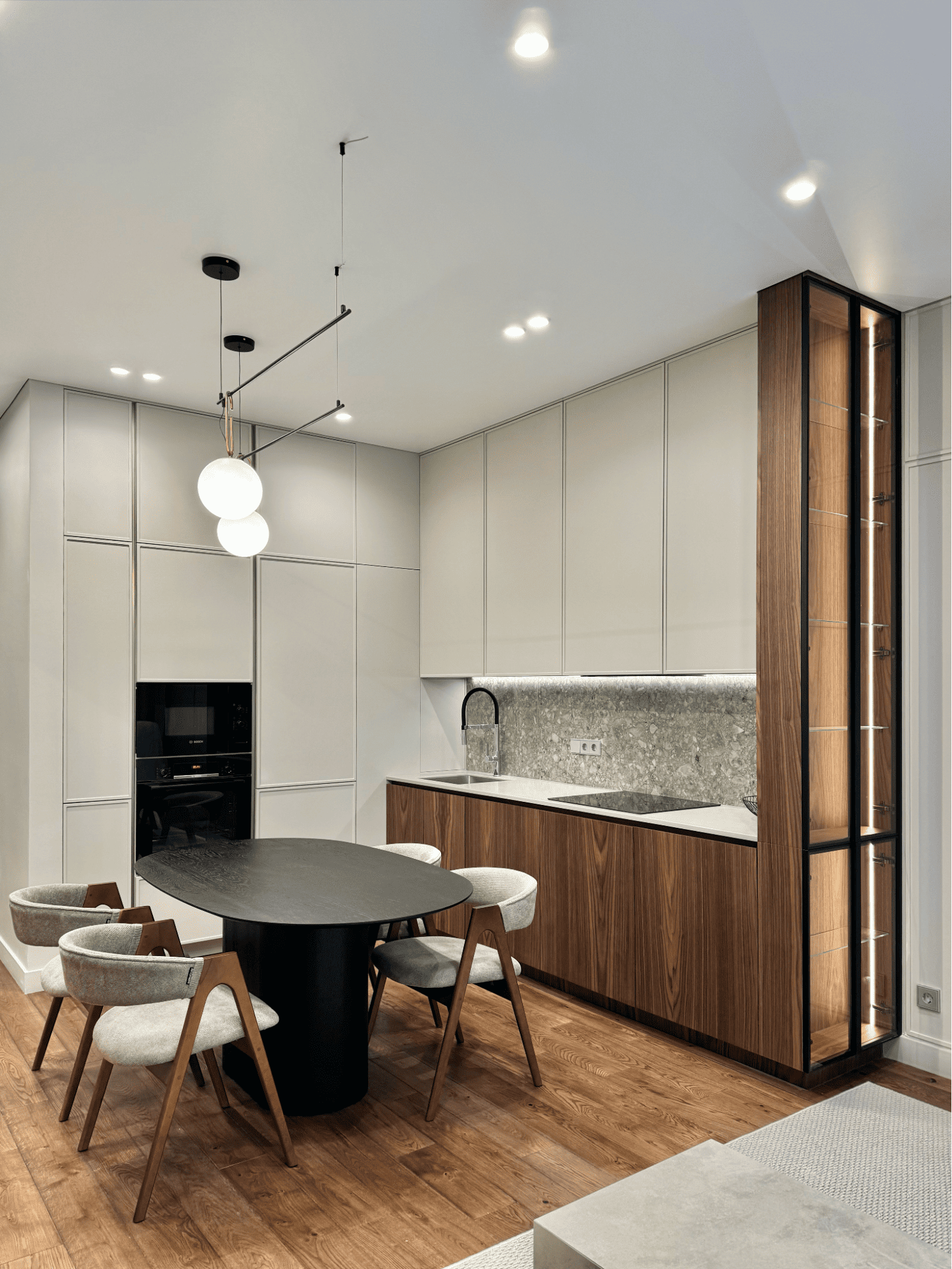 Важным аспектом считается организация зон – рабочей, обеденной и хранения. На первый план в этом вопросе выходит эргономика. Расположение шкафов, выдвижных ящиков и бытовой техники продумывается так. Чтобы все предметы были под рукой. При этом каждый элемент интерьера остается частью единой композиции.