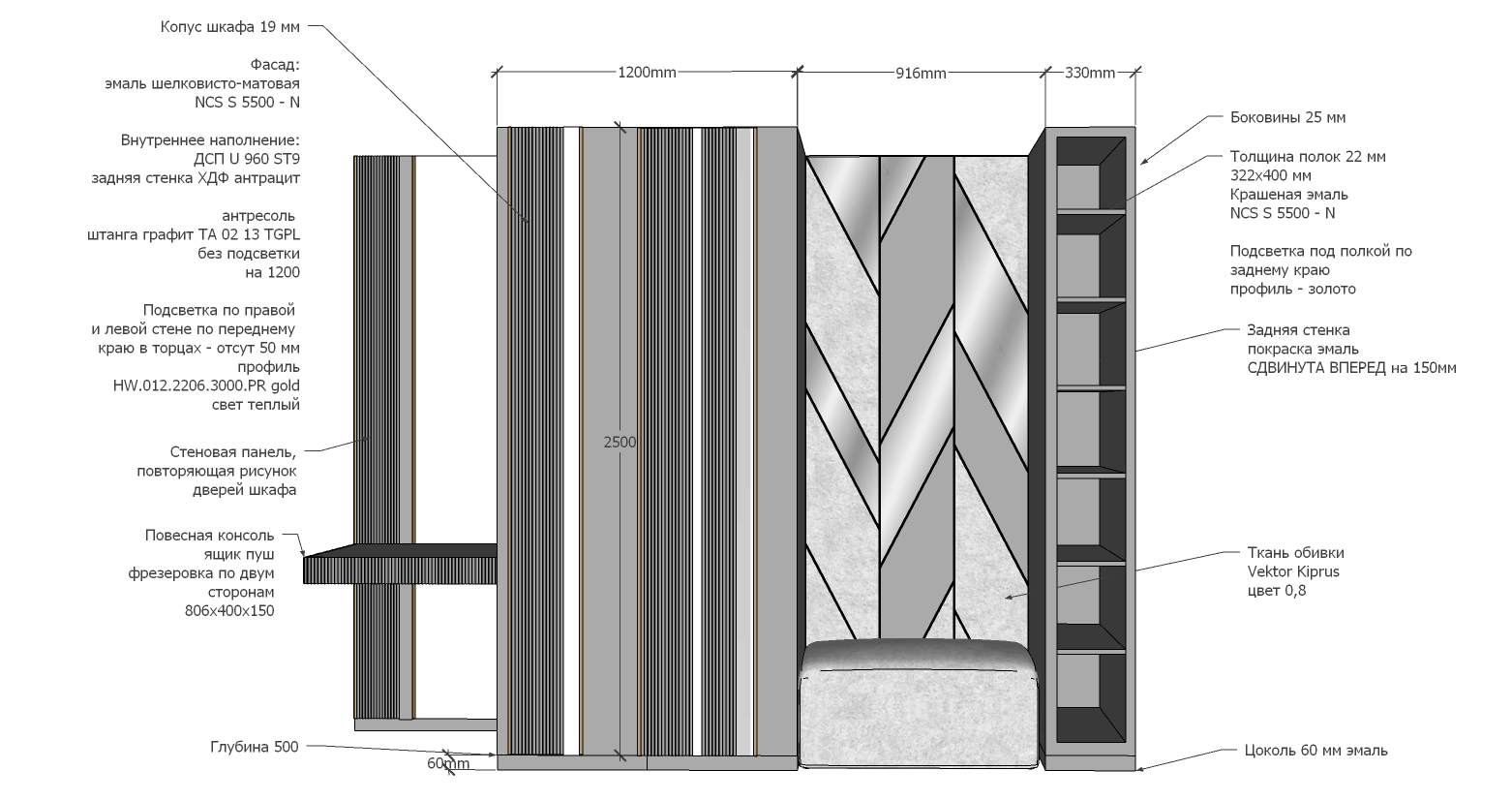 Дизайнерский шкаф должен гармонично вписываться в интерьер, подчеркивать стиль и атмосферу помещения. Для производства изделий в основном используют МДФ, натуральное дерево, металл, стекло или комбинацию таких материалов. Древесина добавит тепла и уюта, стеклянные и зеркальные элементы придадут интерьеру легкость и воздушность, а металл подчеркнет современный характер.