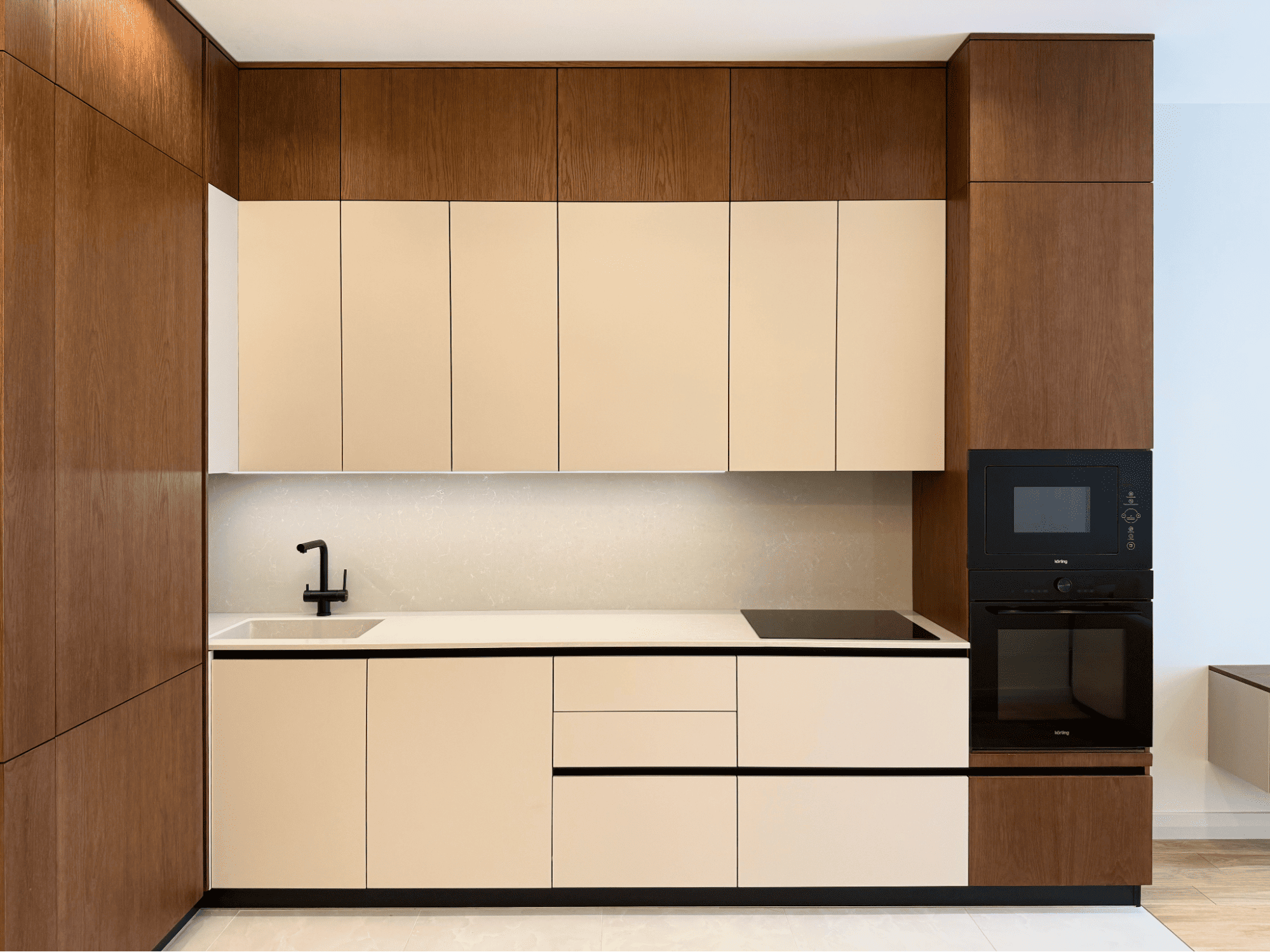 Комбинирование таких материалов, как натуральное дерево, камень, металл и стекло, помогает получить необычные фактуры и акценты. Сочетание матовых поверхностей с глянцевыми фасадами, использование скрытых ручек и систем push-to-open придает мебели современный характер.